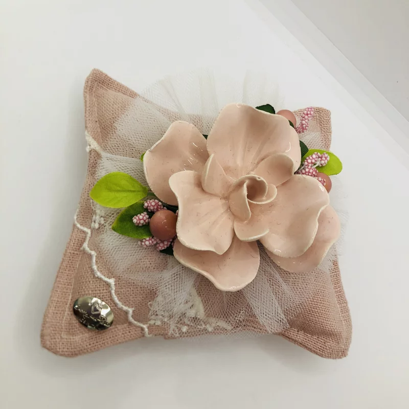 Rosa in capodimonte applicata su cuscino (cm12x12) in tessuto, con confetti e nastri.